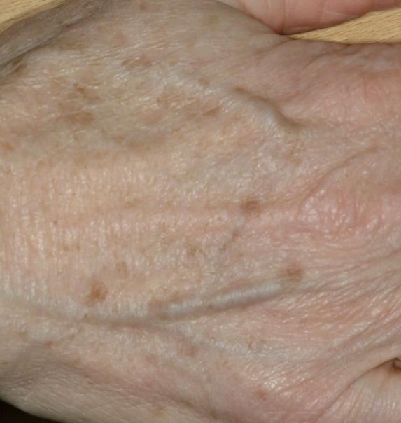 Altersflecke sind flache, bräunlich pigmentierte, gutartige Hautveränderungen, die in der Regel an den Körperstellen entstehen, die viel der Sonne ausgesetzt waren, also vor allem im Gesicht, an den Handrücken und teilweise auch an den Unterarmen.